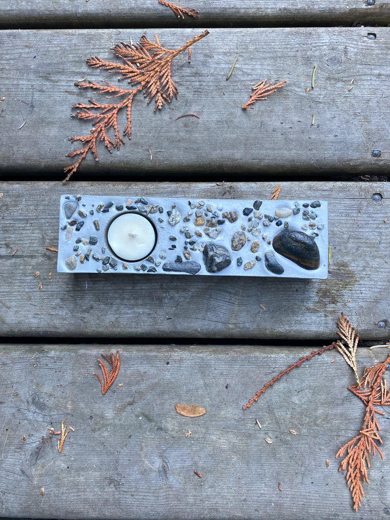8 1/3”x2 1/2”x1 1/4” Rectangular concrete tea light holder, this little beauty is a one of a kind made with naturally tumbled river rock.
