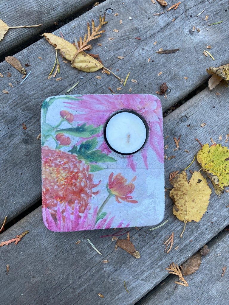 4 1/4"x 4 3/4"concrete tea light holder, this little beauty is a natural cement color with pink and red flower image transfer.